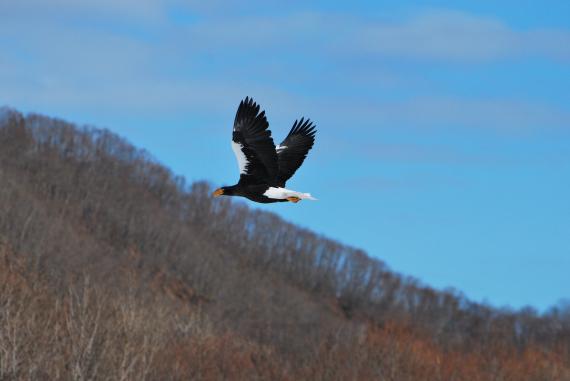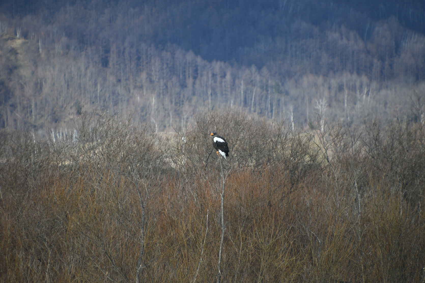 In early winter encounter white-tailed and Stellar’s sea eagles. They look very dignified and cool as they stand on the trees, and graceful as they fly.