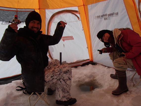 Why not spend some time in a tent specially designed for smelt fishing on a completely frozen lake?