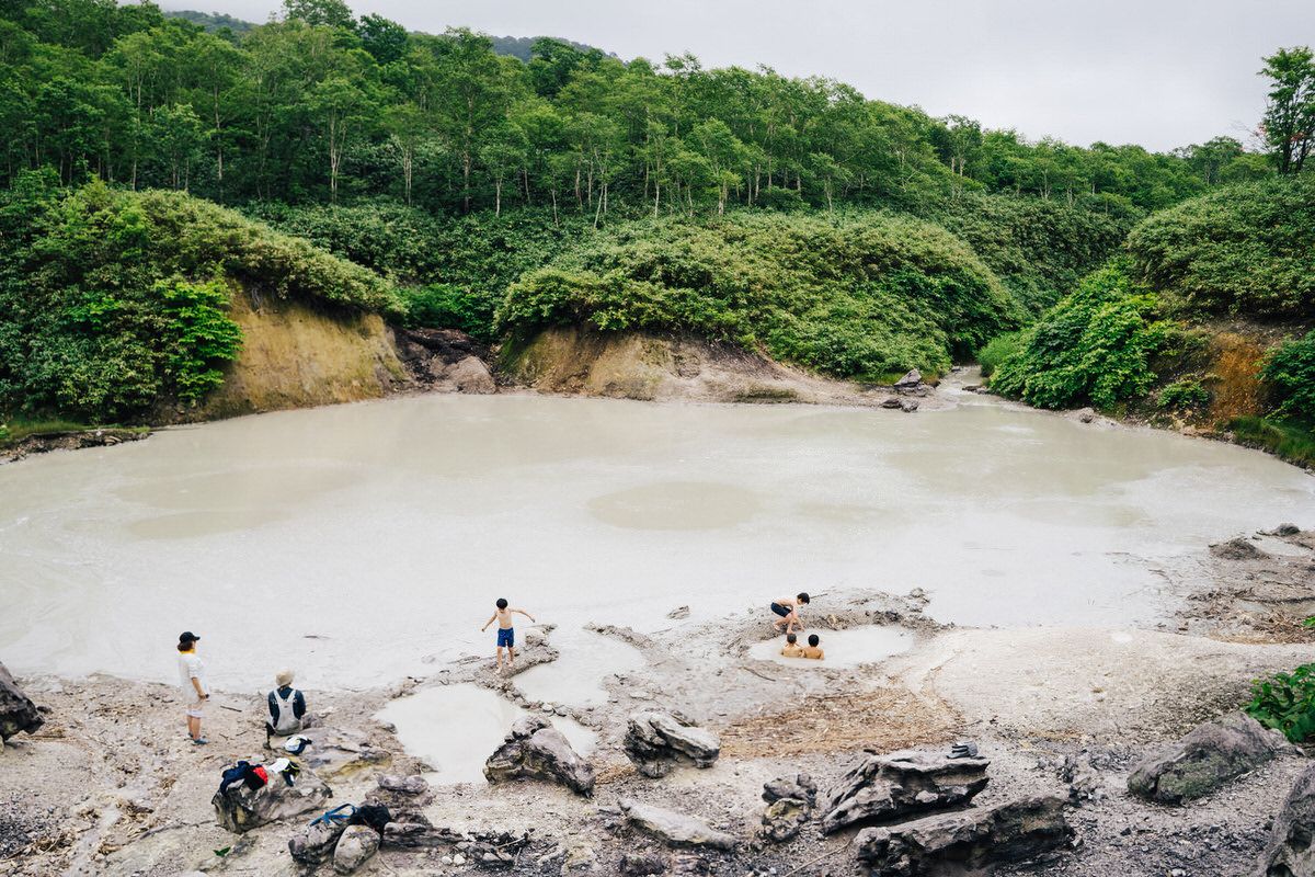 Let’s go to the mountains and fields of Niseko to find a wild onsen! Take a 20 minute trek through the jungle-like mountain path covered in bamboo grass. When the view opens up you will find our destination- a hidden hot spring with sulfur-smelling steam! This is a rare hot spring source where the hot spring deposits themselves are mud. You