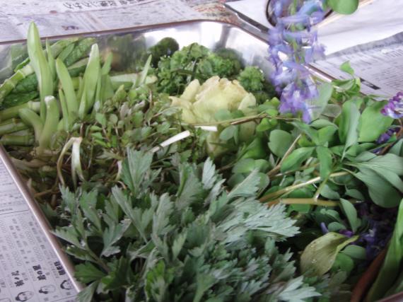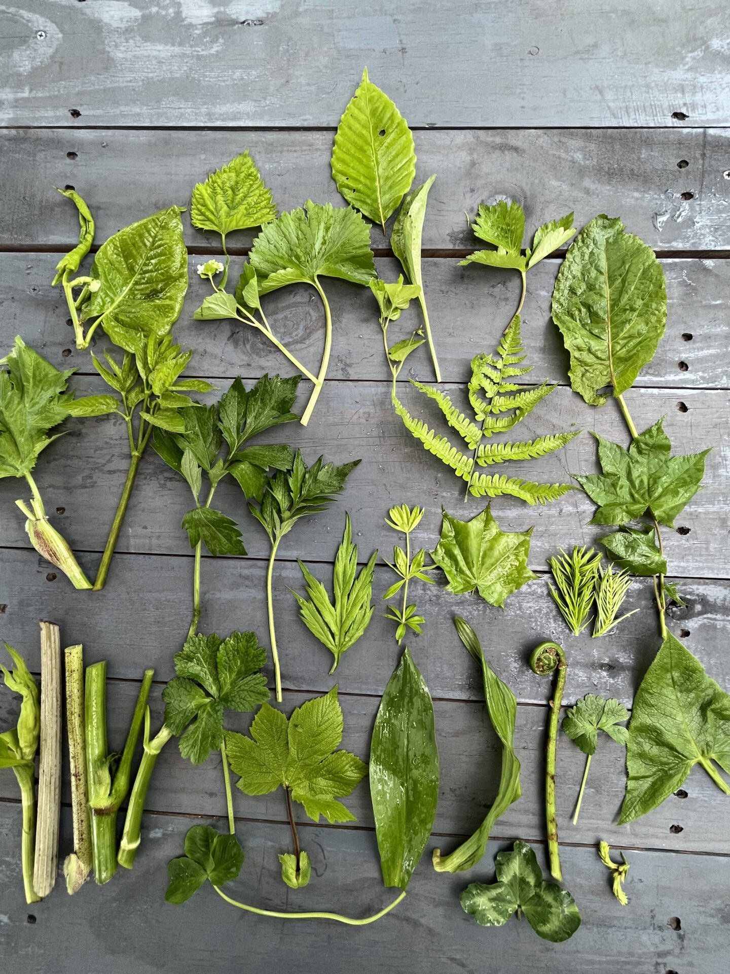 Butterbur sprouts, bracken shoots, taros, Japanese koshiabura, adzuki bean, udo, butterbur, hosta, wild grapes, Japanese kokuwa, mushrooms, and more!