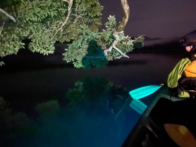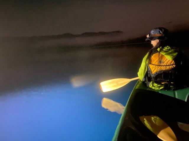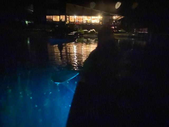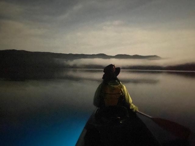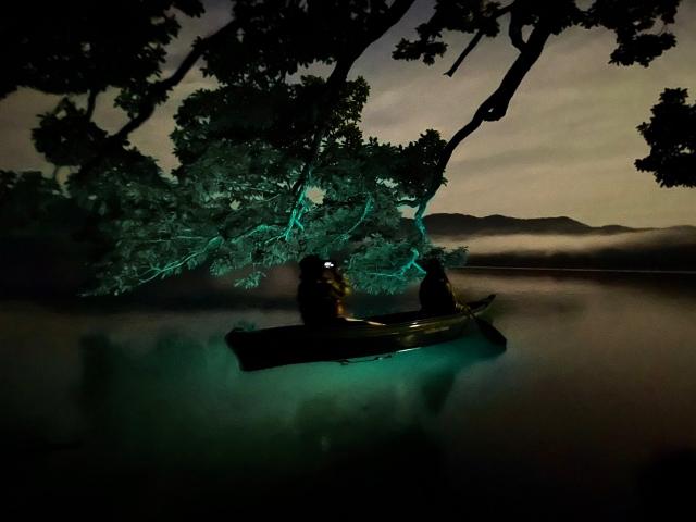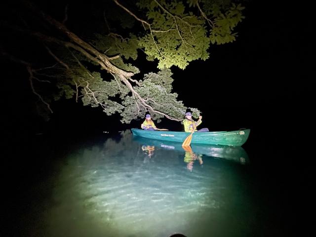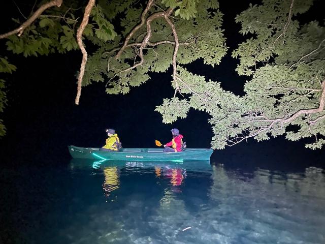 Cruise on a canoe on a pitch black lake! The lights attached to the canoe illuminate the bottom of the lake, creating a fantastical landscape.
