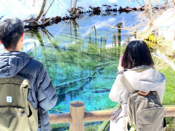 Unlike in summer, in winter, Kaminoko Pond can only be reached by walking on snowshoes. A deep blue even in the winter- it is a truly mysterious sight. The water is so clear that you can see the bottom of the pond, which is about 5 meters wide.