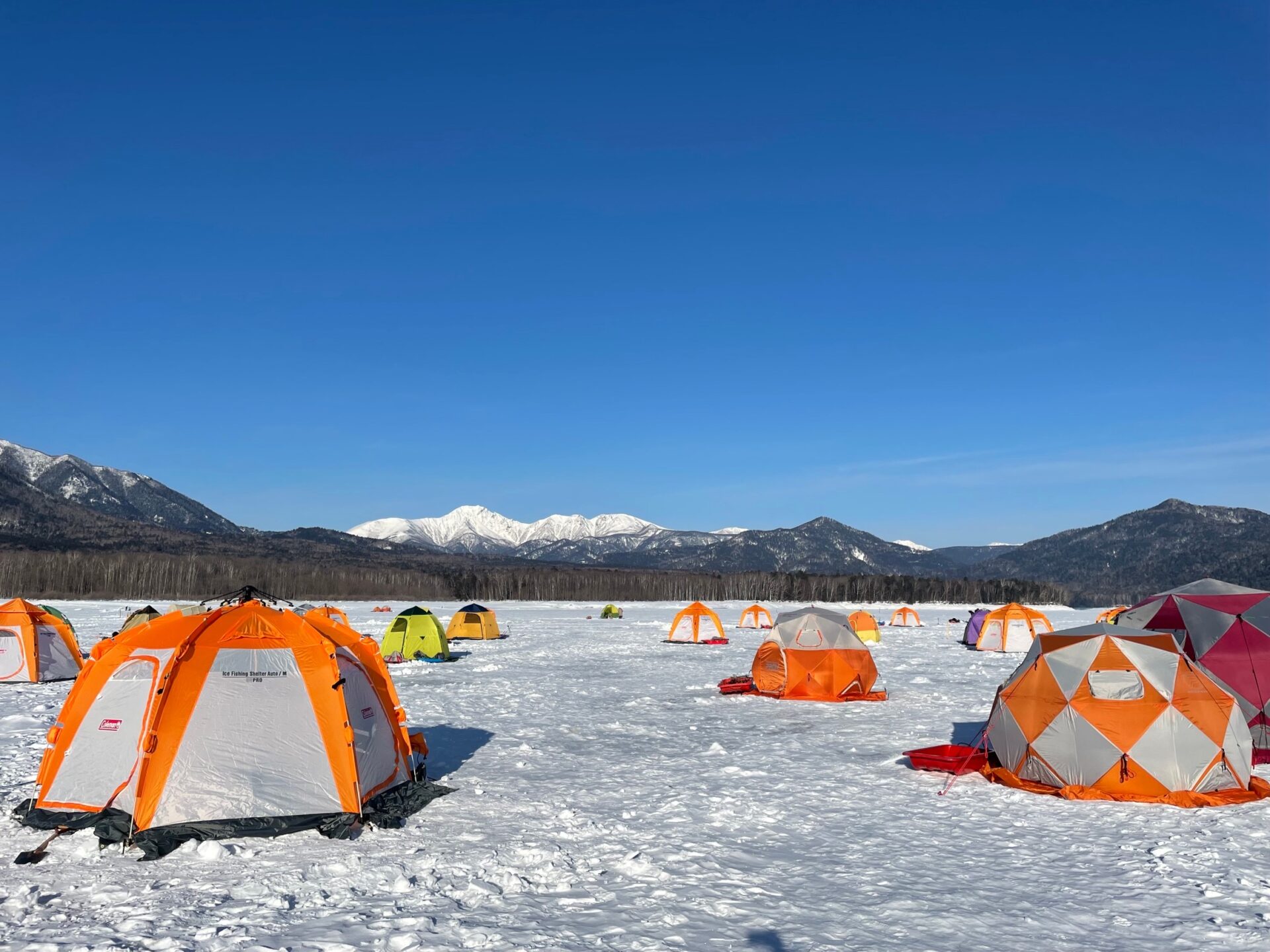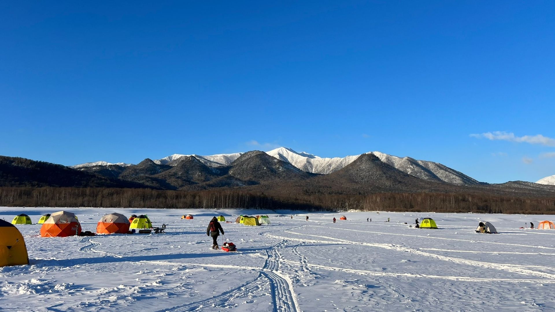 Local smelt fishing is ~1 km from the nearest parking lot to the fishing spot. Typically you would need to carry your tent, fishing gear, and other equipment by sled, set up, and then take it down yourself. This process can be challenging for beginners. However, even considering the hassle of setting up, the magnificent panoramic views of the Daisetsuzan National Park creates many repeat visitors. The waters of Lake Nukabira offer a truly breathtaking 360-degree view of the unique landscapes of Daisetsuzan National Park, stretching as far as the eye can see.